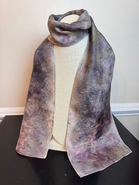 When eco-printing, silk is scoured and then mordanted with a natural element to accept the tannins of the leaves or flowers. Blacks or colored effects are formed with an organically processed 'blanket' placed over the silk. The silk scarf, materials and blanket are wrapped tightly around a dowel and steamed for about an hour. The final scarf is very silky soft!